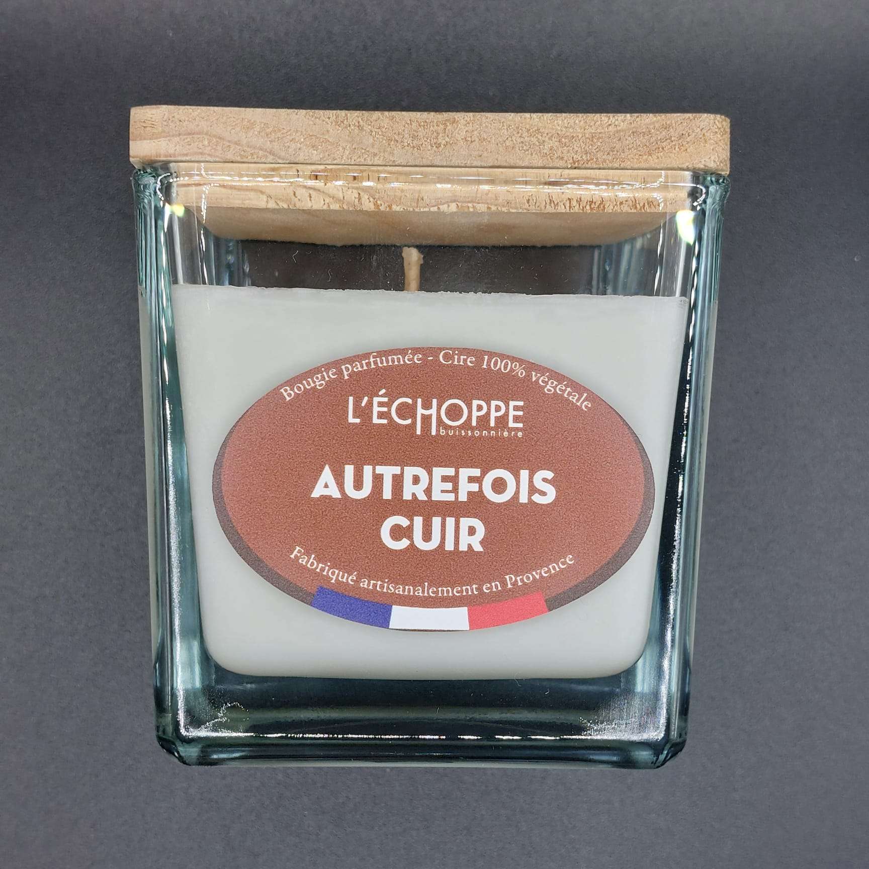 BOUGIE CARRÉ « AUTREFOIS CUIR » DE L’ÉCHOPPE BUISSONIERE 180 gr ( 8 x 8 cm avec un couvercle en bois )